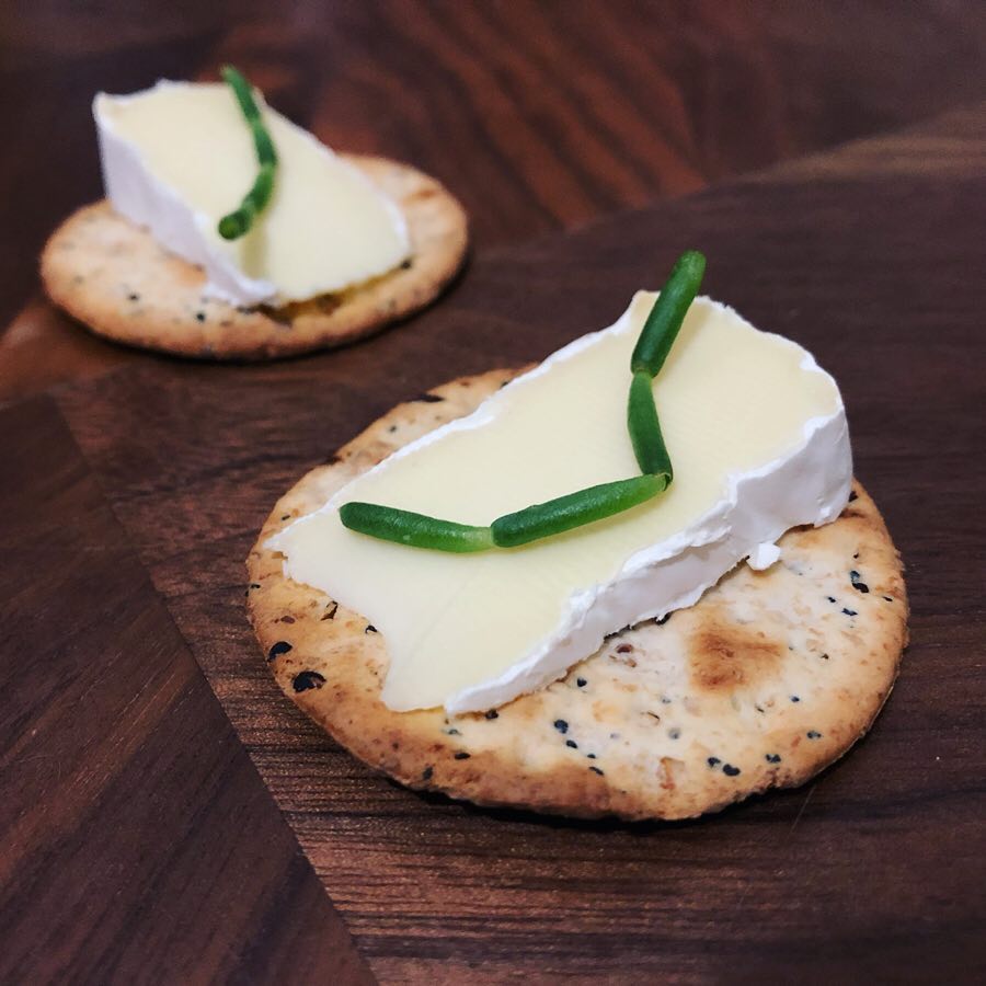 WA Samphire (Tecticornia lepidosperma), an edible succulent, served with brie on a cracker.